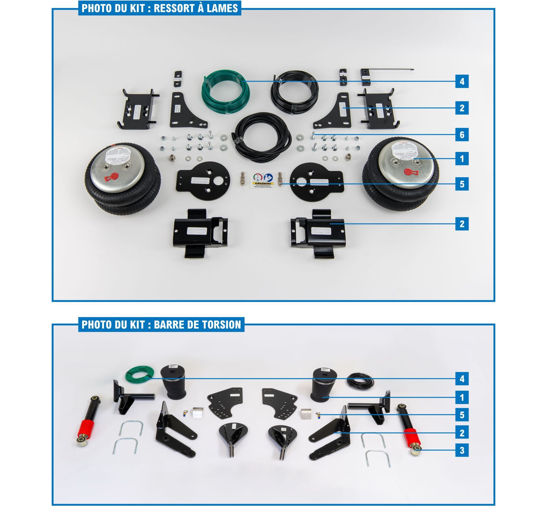 • Sur un véhicule avec barre de torsion, le coussin d’air est monté sur le côté du châssis. Le coussin d’air supporte la barre de torsion existante.