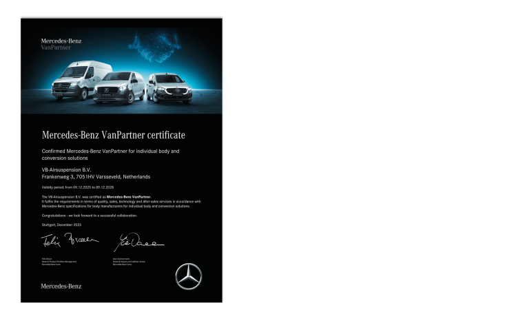Fort de longues années d’expérience et de collaboration avec les constructeurs de véhicules, VB-Airsuspension est en mesure de répondre aux exigences de qualité posées par ce groupe cible. Cela signifie que les normes de qualité que VB-Airsuspension se fixe elle-même en matière de produits, de processus et de tests répondent aux exigences strictes de l’industrie automobile.